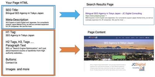 But also locked in the HTML markup of each website are 2 fields you don’t see. One is called the “SEO Title” tag, and the other is the Meta-Description. While these 2 fields are not viewable on your Web Page, they are displayed in the Search Results of any Search Engine such as Google or YahooJP.