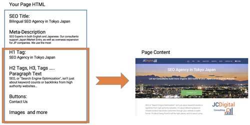 In the diagram below, you can see how the SEO Title and Meta-Description map to the Search Results Page, while the other tags such as the H1 Tag, H2 & H3 tags, paragraph text, buttons, menus and images map to the webpage.