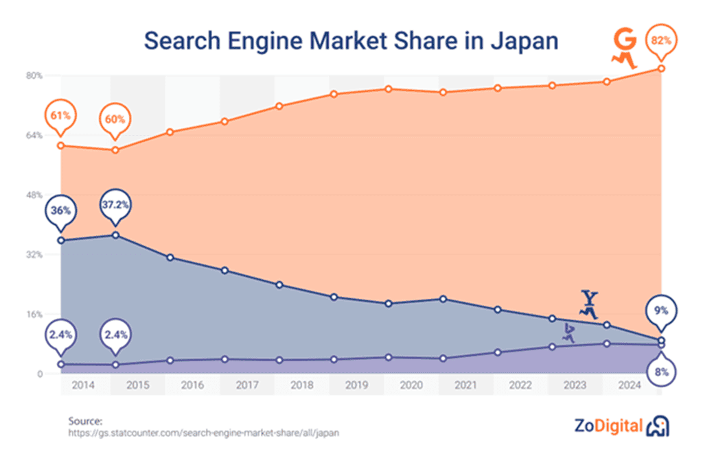 Before we start, let’s clarify what the most popular search engine is in Japan. Right now, that title goes to Google, with almost 90% market share.