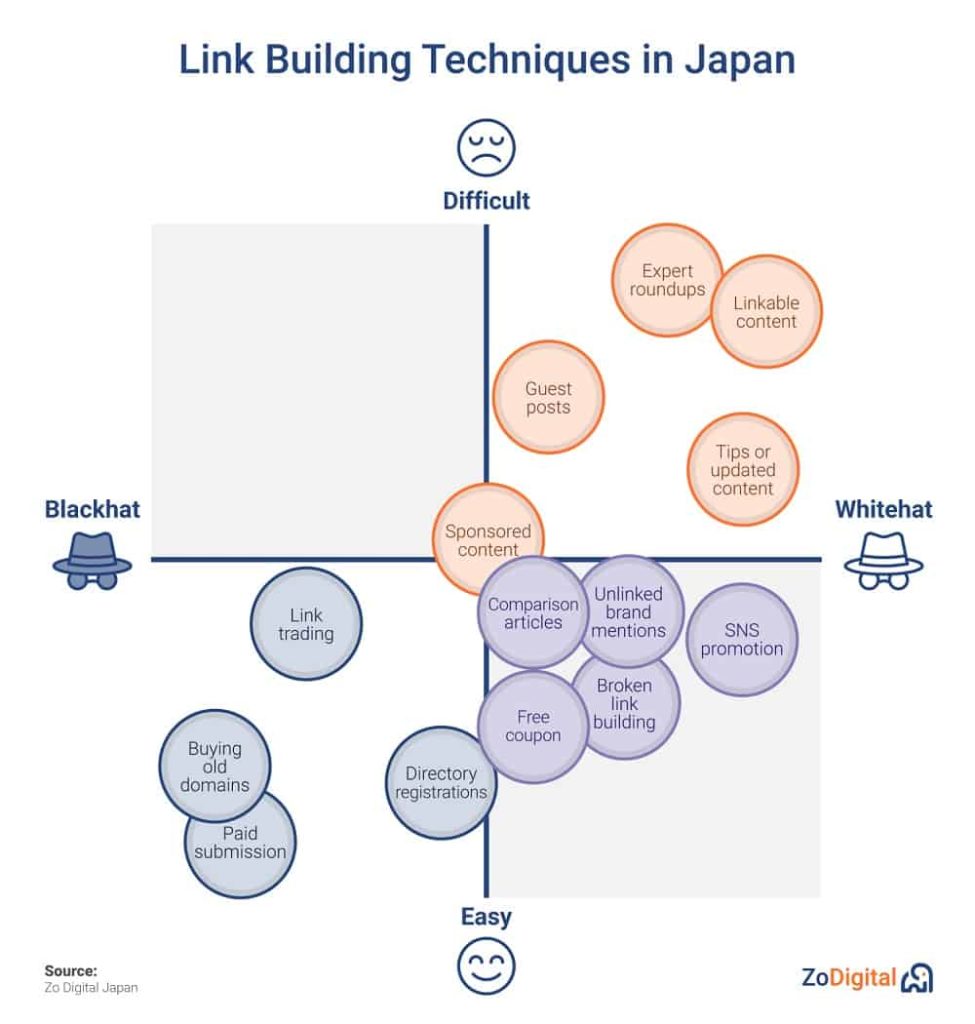 Instead, many of them just ask for a backlink directly, offering money, or build hundreds or thousands of PBNs called “satellite sites” and simply give links back from these sites. Some reasons may be a lack of experienced personnel and low cost-effectiveness, especially in the case of agencies. Link Building in Japan is challenging and costly.