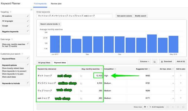 Let’s say you have an E-Commerce website in Japanese. I can think of 4 ways to describe the keyword “Online Shop” in Japanese.