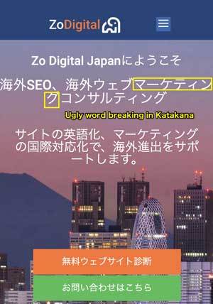 This is a mistake I often see with Japanese sites, and it’s completely understandable. Displaying Japanese text in a web browser at different sizes has challenges. The problem comes from the Japanese language itself. It has no spaces between words. And unfortunately, browsers are not good at breaking works into newlines, especially if that content is in Katakana.